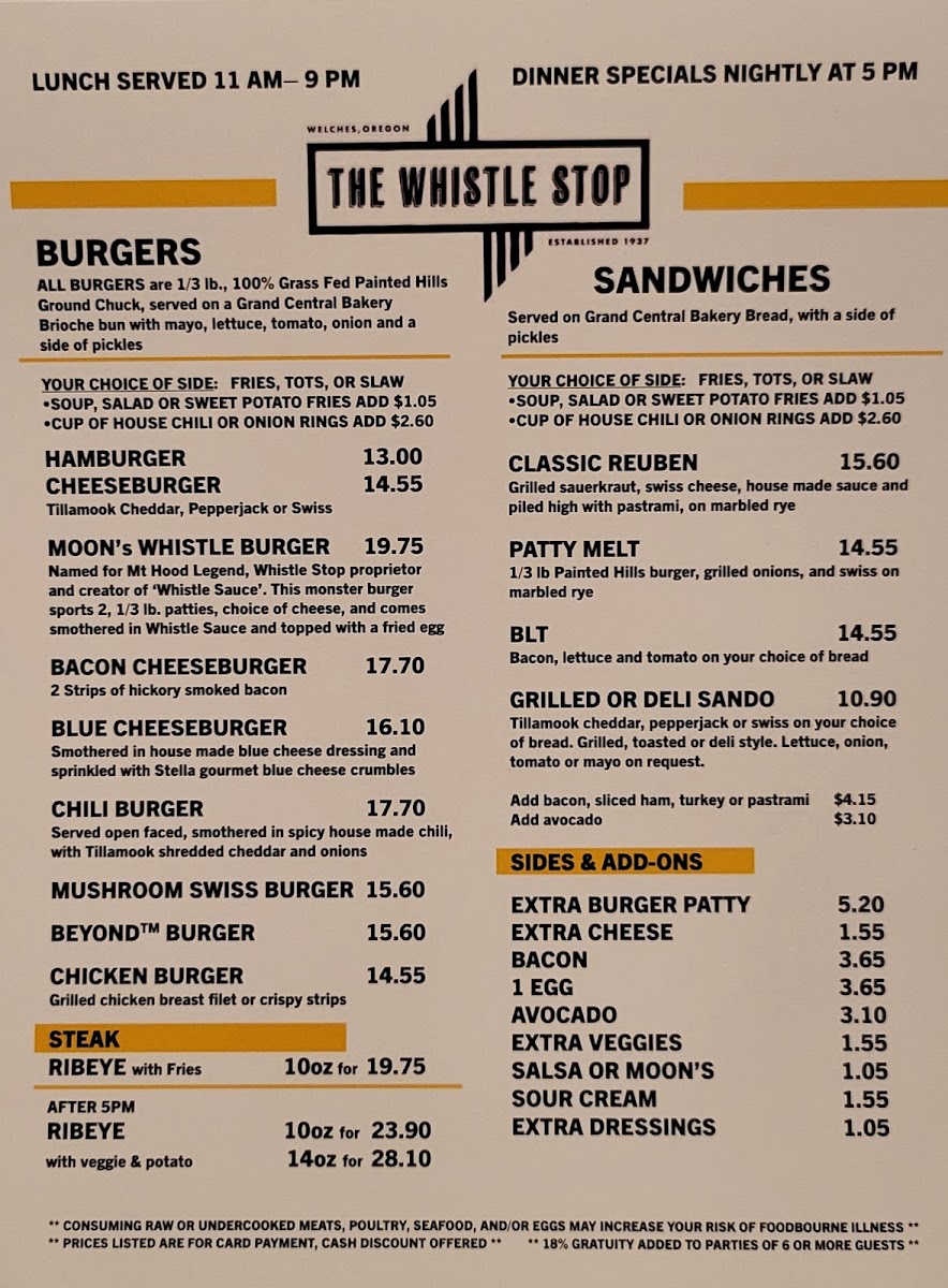 Whistle Stop Welches, nestled in the charming town of Welches, OR, is a delightful culinary gem that captivates both locals and visitors alike. Renowned for its hearty Whistle burger, featuring two succulent patties, and an inviting outdoor space that welcomes pets, the eatery radiates a friendly atmosphere. Guests rave about the crispy fries and comforting breakfast options, all served with genuine warmth from the staff. With its eclectic vibe, lively music, and community-centric feel, Whistle Stop is the ideal stop after a day of adventure at Mt. Hood, making each visit feel like coming home.